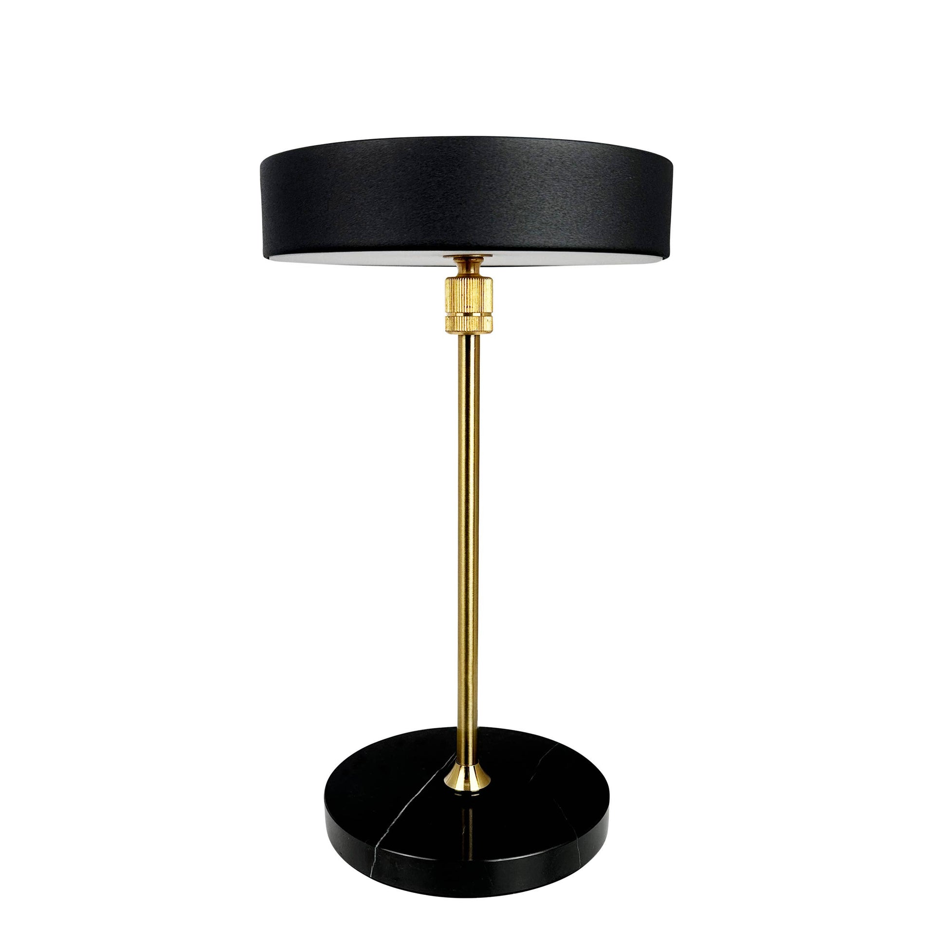Den justerbara skärmen i svart metall kan vinklas och placeras som du vill, medan basen i solid svart marmor ger vikt, stabilitet och en lyxig känsla. Diskreta mässingsdetaljer adderar en elegant touch, och kombinationen av material skapar en balanserad, mångsidig och tidlös design.